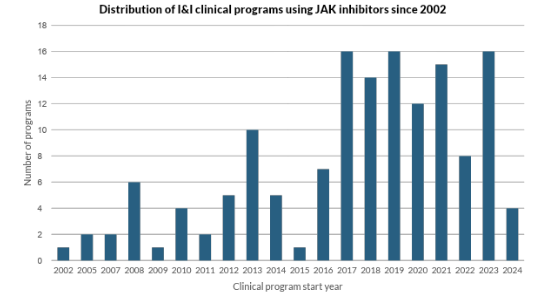 • In 2022, new JAK inhibitor program initiations fell sharply, reflecting cautious reprioritization by sponsors and shifting investment away from the class.